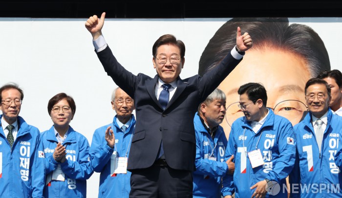 [서울=뉴스핌] 정일구 기자 = 이재명 더불어민주당 대선 후보가 6·3 대통령선거 공식 선거운동 첫날인 12일 오전 '빛의 혁명'을 상징하는 공간인 서울 광화문 청계광장에서 첫 유세를 시작하며 두 팔을 번쩍 들고 있다. 2025.05.12 mironj19@newspim.com