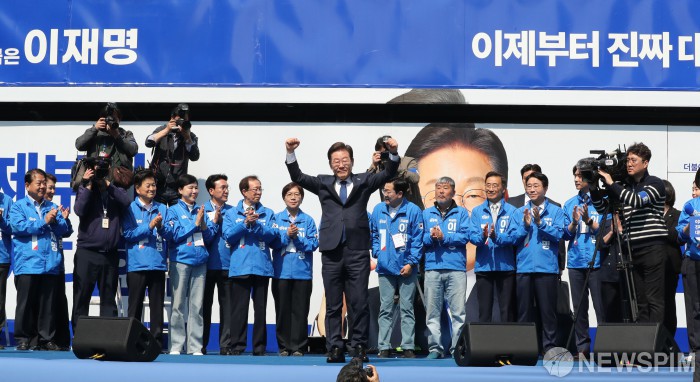 [서울=뉴스핌] 정일구 기자 = 이재명 더불어민주당 대선 후보가 6·3 대통령선거 공식 선거운동 첫날인 12일 오전 '빛의 혁명'을 상징하는 공간인 서울 광화문 청계광장에서 첫 유세를 시작하며 두 팔을 번쩍 들고 있다. 2025.05.12 mironj19@newspim.com