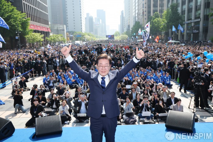 [서울=뉴스핌] 윤채영 기자 = 이재명 더불어민주당 대통령 후보가 공식 선거 운동 첫날인 12일 서울 광화문 청계광장 앞에서 첫 유세를 펼쳤다.