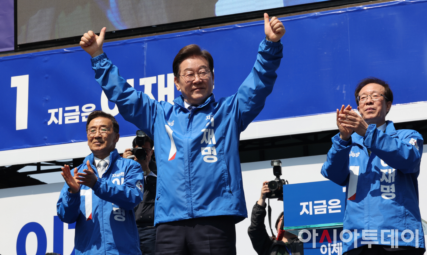 아시아투데이 송의주 기자 = 이재명 더불어민주당 대선후보가 제21대 대통령선거 공식 선거운동이 시작된 12일 서울 청계광장에서 열린 '빛의 혁명' 광화문 유세에서 선거 운동복으로 갈아입고 유권자들에게 인사하고 있다.