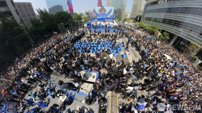 [서울=뉴스핌] 정일구 기자 = 대통령 선거운동 첫날인 12일 서울 종로구 청계광장에 많은 더불어민주당원과 지지자들이 운집한 가운데 이재명 후보가 인사 하고있다. 2025.05.12 mironj19@newspim.com