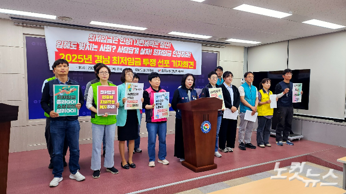 민주노총경남본부와 경남여성연대, 경남청년유니온은 12일 경남도청 프레스센터에서 기자회견을 열고 "최저임금을 받아도 빚지지 않고 살 수 있는 사회가 내란 세력을 척결하고 소외된 국민이 없는 다시 만나는 새로운 세상"이라고 밝혔다.