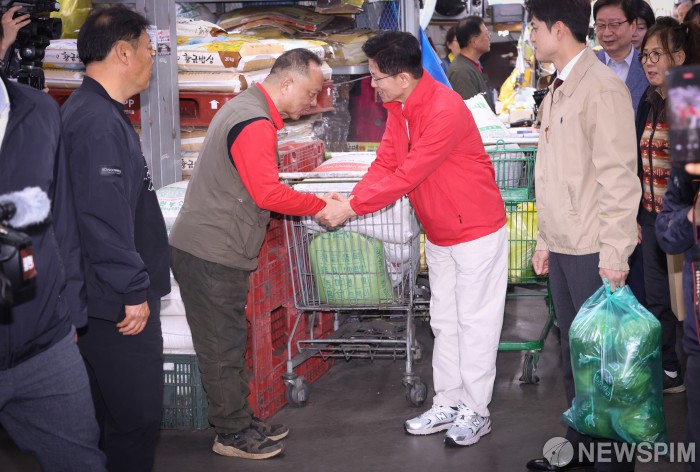 [서울=뉴스핌] 이호형 기자 = 제21대 대통령 선거 공식 선거운동이 시작된 12일 오전 김문수 국민의힘 대선 후보가 서울 송파구 양재대로 가락시장을 방문해 상인들과 인사를 하고 있다. 2025.05.12 leemario@newspim.com |
