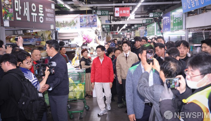 [서울=뉴스핌] 이호형 기자 = 제21대 대통령 선거 공식 선거운동이 시작된 12일 오전 김문수 국민의힘 대선 후보가 서울 송파구 양재대로 가락시장을 방문해 상인들과 인사하고 있다. 2025.05.12 leemario@newspim.com