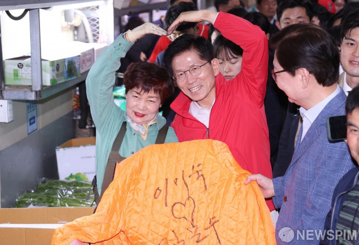 [서울=뉴스핌] 이호형 기자 = 제21대 대통령 선거 공식 선거운동이 시작된 12일 오전 김문수 국민의힘 대선 후보가 서울 송파구 가락시장을 방문해 상인들과 기념촬영을 하고 있다. 2025.05.12 leemario@newspim.com |