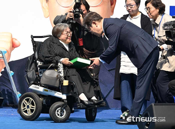 이재명 더불어민주당 대통령 선거 후보가 제21대 대통령선거 공식 선거운동 첫 날인 12일 서울 청계광장에서 열린 '빛의 혁명' 광화문 유세에서 국민목소리와 질문을 담은 '녹서 2025'를 받고 있다.