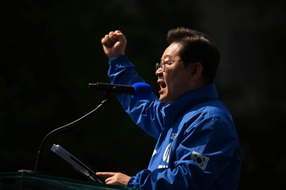 이재명 더불어민주당 대통령 후보가 제21대 대통령선거 공식 선거운동이 시작된 12일 서울 종로구 청계광장에서 열린 중앙선거대책위원회 출정식에서 시민들에게 지지를 호소하고 있다.