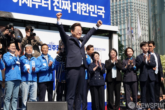 [서울=뉴스핌] 정일구 기자 = 제21대 대통령선거 공식 선거운동 첫날인 12일 오전 서울 종로구 청계광장에서 열린 출정식 및 첫 유세에서 이재명 더불어민주당 대선 후보가 지지자들을 향해 인사하고 있다. 2025.05.12 / 2025.05.12 mironj19@newspim.com