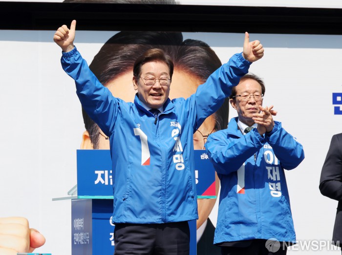 [서울=뉴스핌] 정일구 기자 = 제21대 대통령선거 공식 선거운동 첫날인 12일 오전 서울 종로구 청계광장에서 열린 출정식 및 첫 유세에서 이재명 더불어민주당 대선 후보가 지지자들을 향해 인사하고 있다. 2025.05.12 / 2025.05.12 mironj19@newspim.com