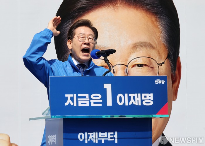 [서울=뉴스핌] 정일구 기자 = 제21대 대통령선거 공식 선거운동 첫날인 12일 오전 서울 종로구 청계광장에서 열린 출정식 및 첫 유세에서 이재명 더불어민주당 대선 후보가 연설을 하고 있다. 2025.05.12 mironj19@newspim.com