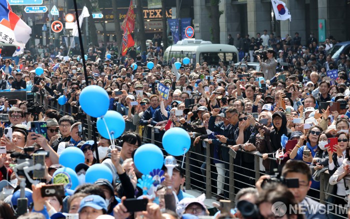 [서울=뉴스핌] 정일구 기자 = 더불어민주당 지지자들이 12일 서울 청계광장에서 열린 이재명 대선후보의 연설을 듣으며 환호하고 있다. 2025.05.12 mironj19@newspim.com