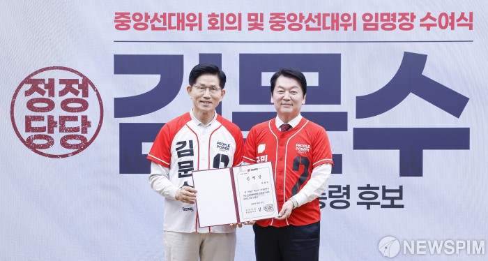 [서울=뉴스핌] 최지환 기자 = 김문수 국민의힘 대선 후보가 12일 오전 서울 영등포구 여의도 국민의힘 중앙당사에서 열린 중앙선대위 임명장 수여식에서 안철수 공동선대위원장에게 임명장 전달 후 기념촬영을 하고 있다. 2025.05.12 choipix16@newspim.com