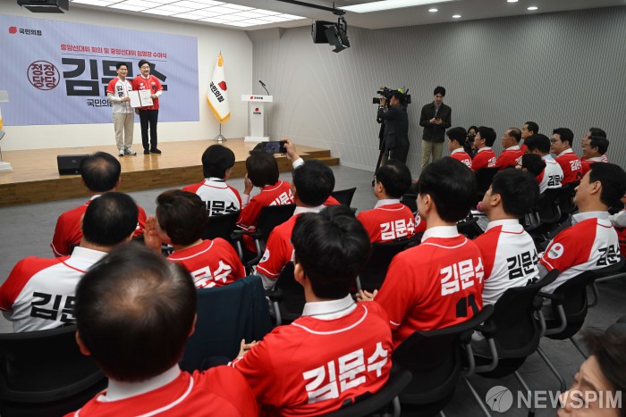 [서울=뉴스핌] 최지환 기자 = 김문수 국민의힘 대선 후보가 12일 오전 서울 영등포구 여의도 국민의힘 중앙당사에서 열린 중앙선대위 임명장 수여식에서 권성동 공동선대위원장에게 임명장 전달 후 기념촬영을 하고 있다. 2025.05.12 choipix16@newspim.com