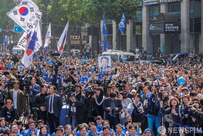 [서울=뉴스핌] 정일구 기자 = 이재명 더불어민주당 대선 후보가 12일 오전 서울 광화문 청계광장에서 첫번째 선거 유세를 시작한 가운데 지지자들이 환호하고 있다. 2025.05.12 mironj19@newspim.com