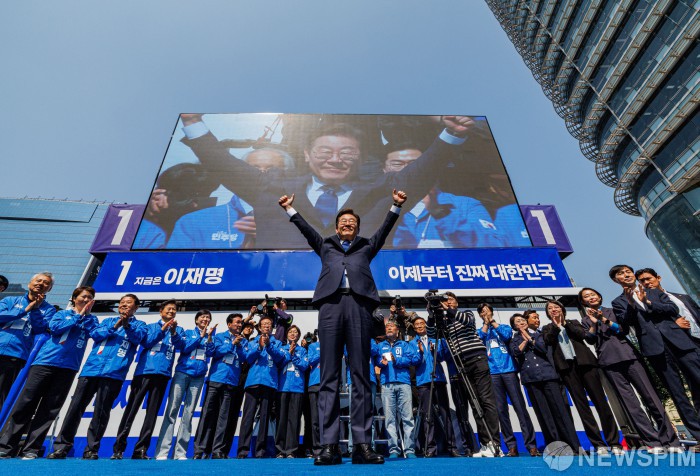 [서울=뉴스핌] 정일구 기자 = 제21대 대통령선거 공식 선거운동 첫날인 12일 오전 서울 종로구 청계광장에서 열린 출정식 및 첫 유세에서 이재명 더불어민주당 대선 후보가 지지자들을 향해 인사하고 있다. 2025.05.12 mironj19@newspim.com