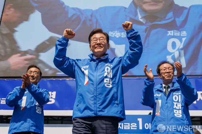 [서울=뉴스핌] 정일구 기자 = 제21대 대통령선거 공식 선거운동 첫날인 12일 오전 서울 종로구 청계광장에서 열린 출정식 및 첫 유세에서 이재명 더불어민주당 대선 후보가 지지자들을 향해 인사하고 있다. 2025.05.12 mironj19@newspim.com