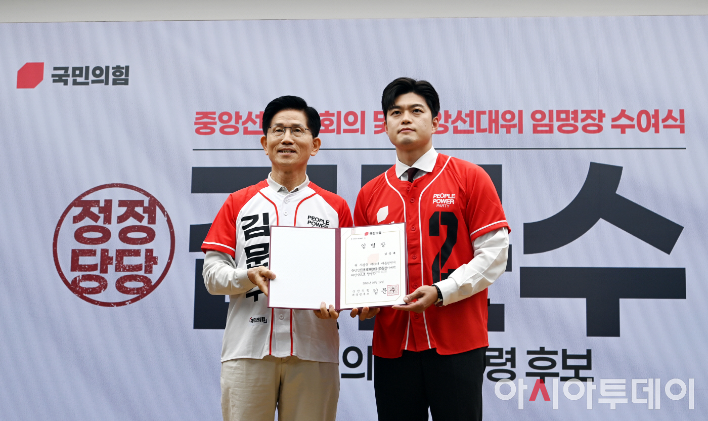 아시아투데이 이병화 기자 = 김문수 국민의힘 대선 후보가 12일 오전 서울 영등포구 여의도 국민의힘 중앙당사에서 열린 중앙선대위 임명장 수여식에서 김용태 의원에게 임명장을 수여한 뒤 기념사진을 찍고 있다.