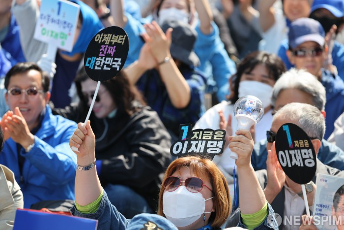 [서울=뉴스핌] 정일구 기자 = 12일 오전 서울 청계광장에서 열린 더불어민주당 중앙선거대책위원회 출범식 및 첫 유세에서 이재명 대선 후보 지지자들이 환호하고 있다. 2025.05.12 mironj19@newspim.com |