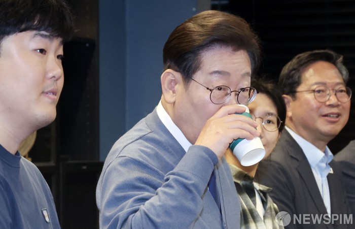 [판교=뉴스핌] 정일구 기자 = 이재명 더불어민주당 대선 후보가 12일 경기도 성남시 분당구(판교) 한 오피스텔에서 'K-혁신' 브라운백미팅에 참여해 판교 IT개발자 2030 직장인들과 간담회를 갖고 있다. 2025.05.12 mironj19@newspim.com