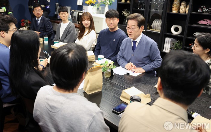 [판교=뉴스핌] 정일구 기자 = 이재명 더불어민주당 대선후보가 제21대 대통령선거 공식 선거운동이 시작된 12일 경기 성남시 분당구 판교역 인근 미팅룸에서 열린 'K-혁신' 브라운백 미팅에서 IT 개발자들과 대화하고 있다. 2025.05.12 mironj19@newspim.com