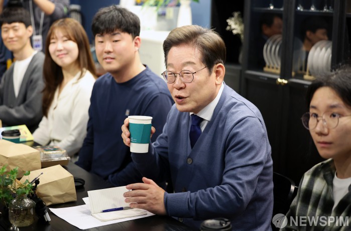 [판교=뉴스핌] 정일구 기자 = 이재명 더불어민주당 대선후보가 제21대 대통령선거 공식 선거운동이 시작된 12일 경기 성남시 분당구 판교역 인근 미팅룸에서 열린 'K-혁신' 브라운백 미팅에서 IT 개발자들과 대화하고 있다. 2025.05.12 mironj19@newspim.com