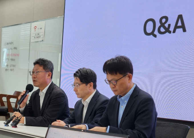 김희섭 SKT PR센터장, 임봉호 MNO 사업부장, 류정환 네트워크인프라센터장(왼쪽부터)이 일일브리핑을 하고 있다. /사진=SKT |