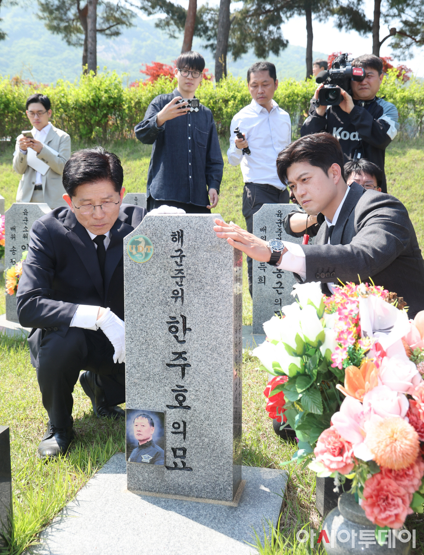 [포토] 한주호 준위 묘비 어루만지는 김문수