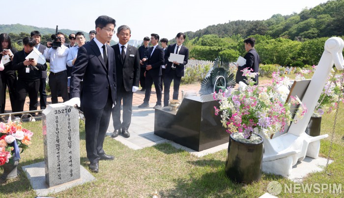 [대전=뉴스핌] 최지환 기자 = 김문수 국민의힘 대선후보가 12일 대전 유성구 국립대전현충원을 찾아 천안함46용사묘역을 참배하고 있다. 2025.05.12 choipix16@newspim.com