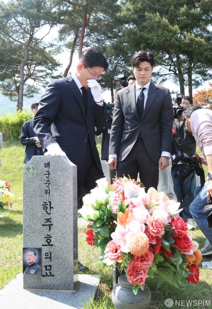 [대전=뉴스핌] 최지환 기자 = 김문수 국민의힘 대선후보가 12일 대전 유성구 국립대전현충원을 찾아 한주호 준위 묘역을 참배 중 눈물을 흘리고 있다. 2025.05.12 choipix16@newspim.com