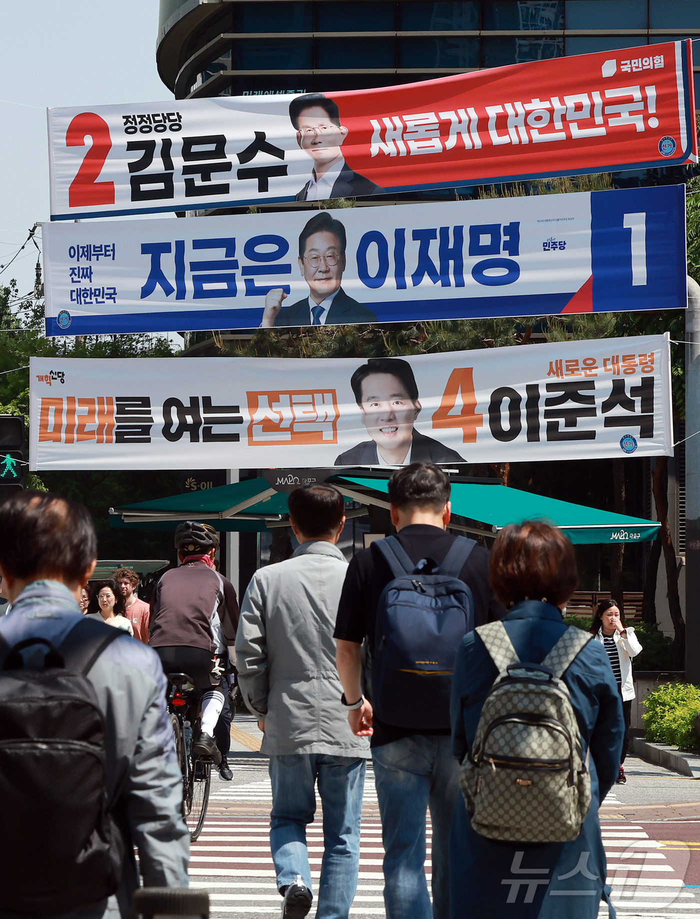 (서울=뉴스1) 김진환 기자 = 제21대 대통령 선거 공식 선거운동이 시작된 12일 서울 시내 한 거리에 이재명 더불어민주당 대통령 후보와 김문수 국민의힘 대통령 후보, 이준석 개혁신당 대통령 후보의 현수막이 걸려 있다. 2025.5.12/뉴스1