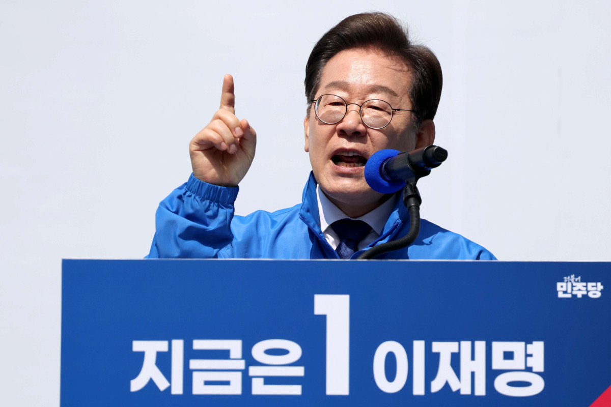 이재명 더불어민주당 대선후보가 12일 서울 종로구 청계광장에서 출정식을 갖고 첫 유세를 하고 있다. 신태현 기자 holjjak@ |