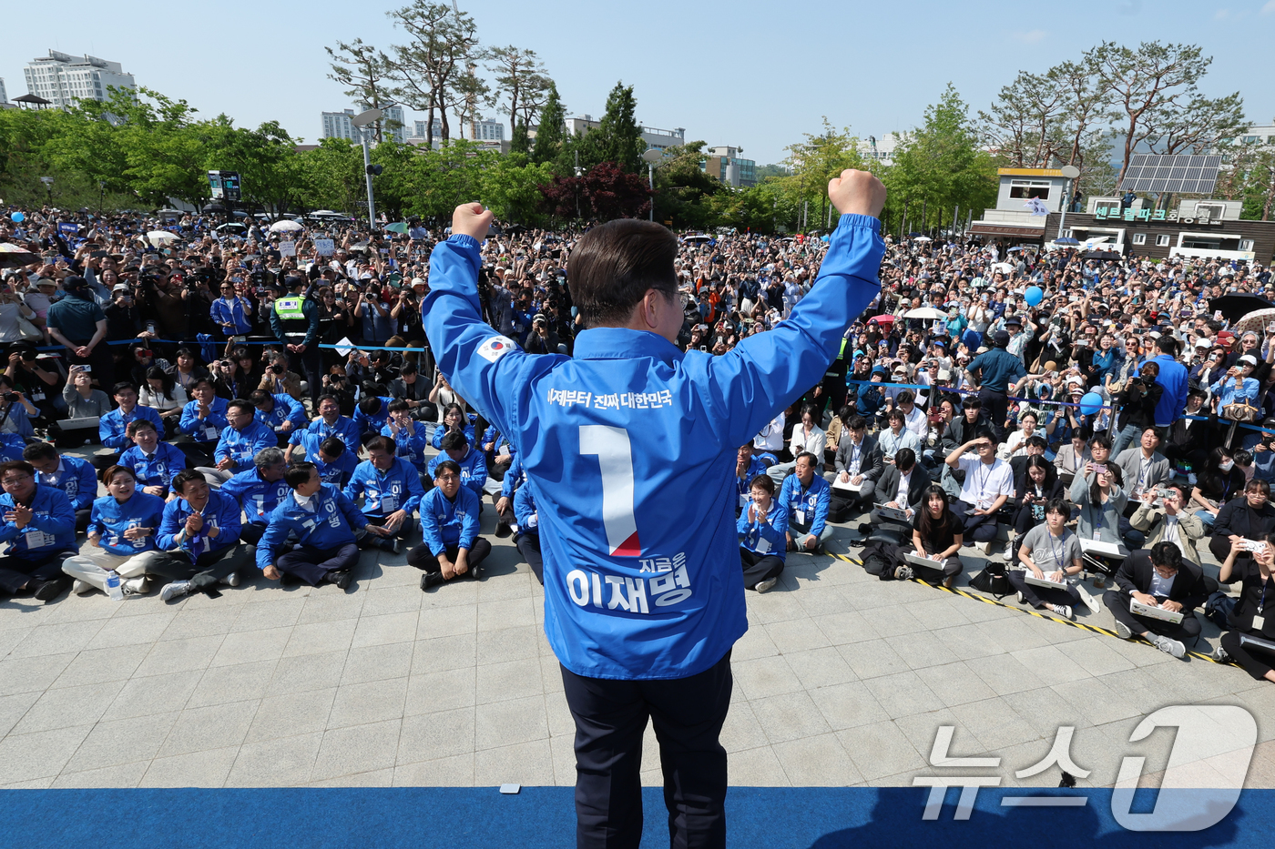 (화성=뉴스1) 안은나 기자 = 이재명 더불어민주당 대통령 후보가 제21대 대통령 선거 공식 선거운동 첫날인 12일 오후 경기 화성시 동탄 센트럴파크 음악분수중앙광장에서 연설에 앞서 인사하고 있다. 2025.5.12/뉴스1