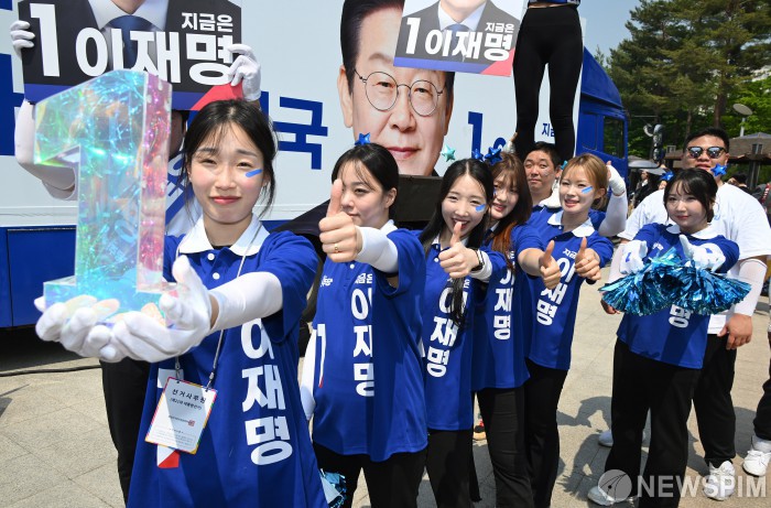[화성=뉴스핌] 김학선 기자 = 제21대 대통령 선거 공식 선거운동이 시작된 12일 이재명 더불어민주당 선거 유세원들이 경기 화성시 동탄 센트럴파크에서 기호 1번을 상징하는 엄지를 치켜세우며 이 후보의 지지를 호소하고 있다. 2025.05.12 yooksa@newspim.com