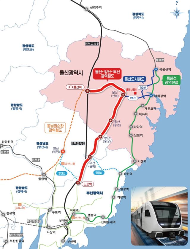 비수도권 최초로 건설을 추진 중인 부산~양산~울산 광역철도는 KTX울산역에서 양산 웅상, 부산 노포를 연결하는 길이 48.8㎞ 노선이다. 총 사업비는 3조424억 원, 2030년 개통이 목표다.