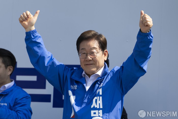 [화성=뉴스핌] 김학선 기자 = 이재명 더불어민주당 대선후보가 12일 오후 경기도 화성시 동탄 센트럴파크 음악분수중앙광장에서 열린 ‘K-반도체' 동탄 집중유세에서 지지자들의 환호에 손을 들어 답을 하고 있다. 2025.05.12 yooksa@newspim.com