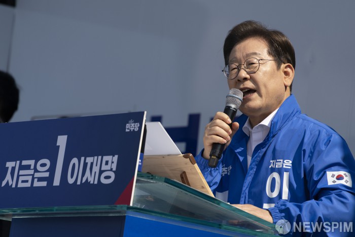 [화성=뉴스핌] 김학선 기자 = 이재명 더불어민주당 대선후보가 12일 오후 경기도 화성시 동탄 센트럴파크 음악분수중앙광장에서 열린 ‘K-반도체' 동탄 집중유세에서 발언을 하고 있다. 2025.05.12 yooksa@newspim.com |