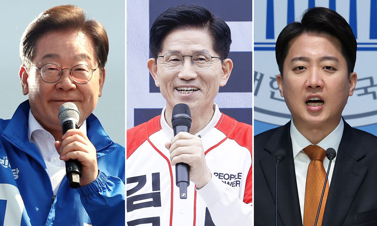제21대 대통령선거 공식 선거운동 첫날인 12일 왼쪽부터 더불어민주당 이재명 대선 후보와 국민의힘 김문수 대선 후보, 개혁신당 이준석 대선 후보가 공식선거 운동을 벌이고 있다. 뉴시스, 뉴스1 |