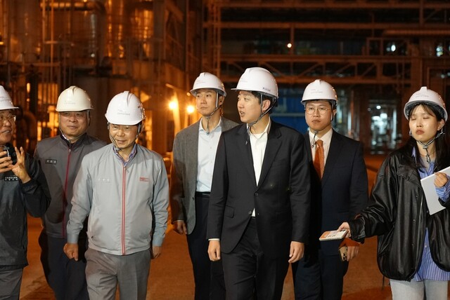 제21대 대통령 선거 공식 선거운동이 시작된 12일 새벽, 이준석 개혁신당 대통령 후보가 전남 여수시 금호피앤비화학 여수2공장을 방문해 현장을 둘러보고 있다. 개혁신당 제공 |