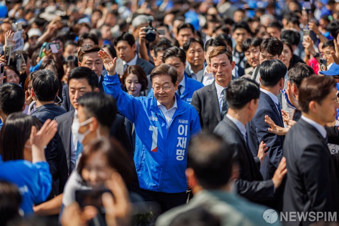 [화성=뉴스핌] 김학선 기자 =이재명 더불어민주당 대통령 후보가 12일 오후 경기 화성 동탄 센트럴파크 음악분수중앙광장 유세를 마치고 지지자들에게 인사를 하고 있다. 2025.05.12 yooksa@newspim.com |