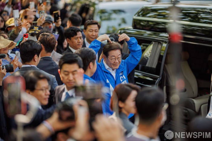 [화성=뉴스핌] 김학선 기자 =이재명 더불어민주당 대통령 후보가 12일 오후 경기 화성 동탄 센트럴파크 음악분수중앙광장 유세를 마치고 지지자들에게 인사를 하고 있다. 2025.05.12 yooksa@newspim.com |