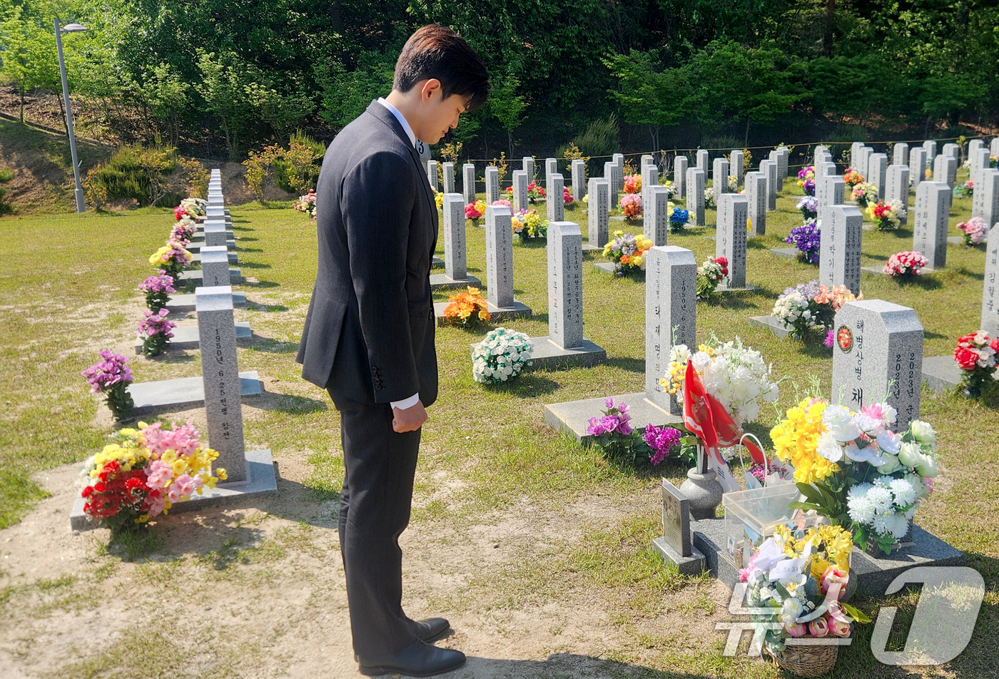 국민의힘 비상대책위원장에 내정된 김용태 의원이 12일 대전 유성구 국립대전현충원을 찾아 채 상병 묘역을 참배하고 있다. (국민의힘 제공. 재판매 및 DB 금지) 2025.5.12/뉴스1 |