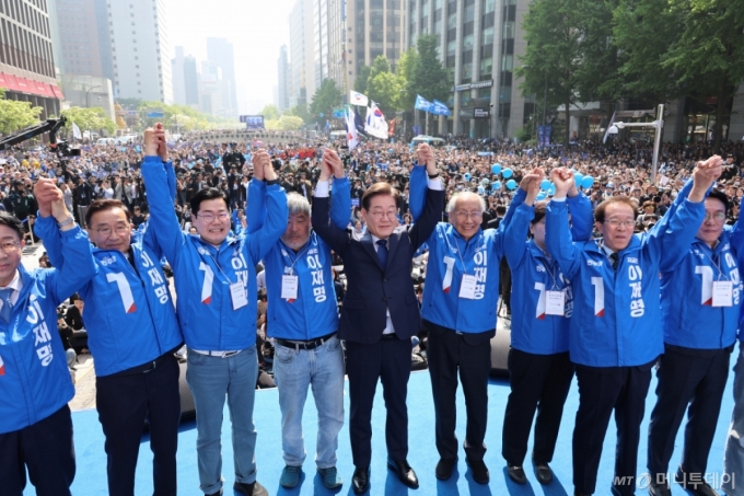 이재명 더불어민주당 대선 후보가 서울 광화문 청계광장에서 대선 출정식을 통해 22일간의 공식 선거운동에 돌입했다. 민주당 중앙선거대책위원회 총괄선대위원장단과 당 지도부 등은 권역별로 뛰며 대선 승리를 위해 원팀으로서 총력을 다한다는 계획이다.