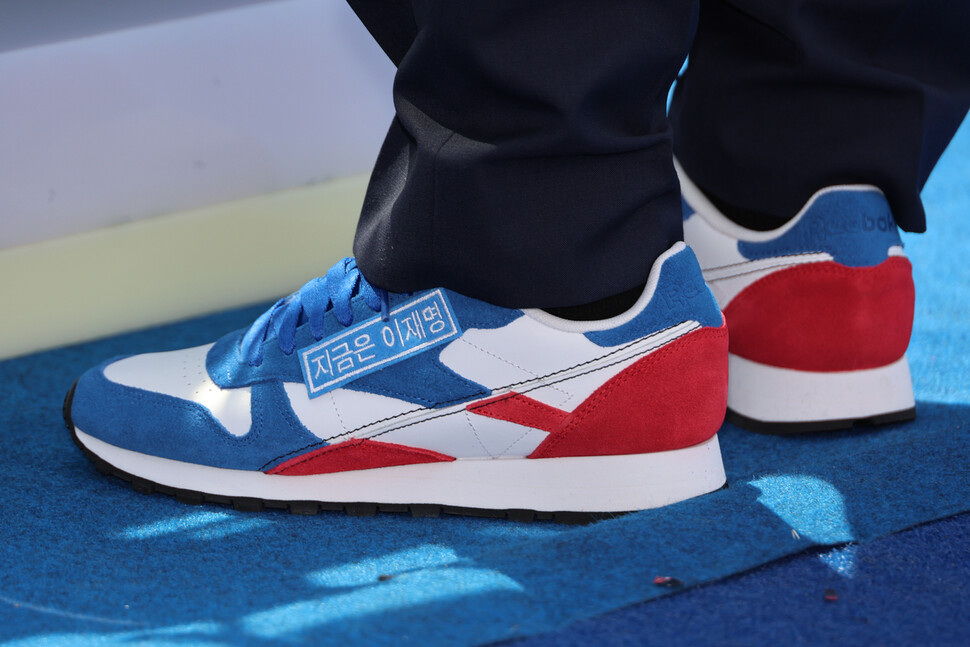 이재명 더불어민주당 대통령 후보가 6·3 대통령선거 공식 선거운동 첫날인 12일 서울 광화문 청계광장에서 열린 중앙선대위 출정식 및 첫 유세에서 ‘지금은 이재명’이라는 문구가 붙은 운동화를 신고 있다. 연합뉴스 |