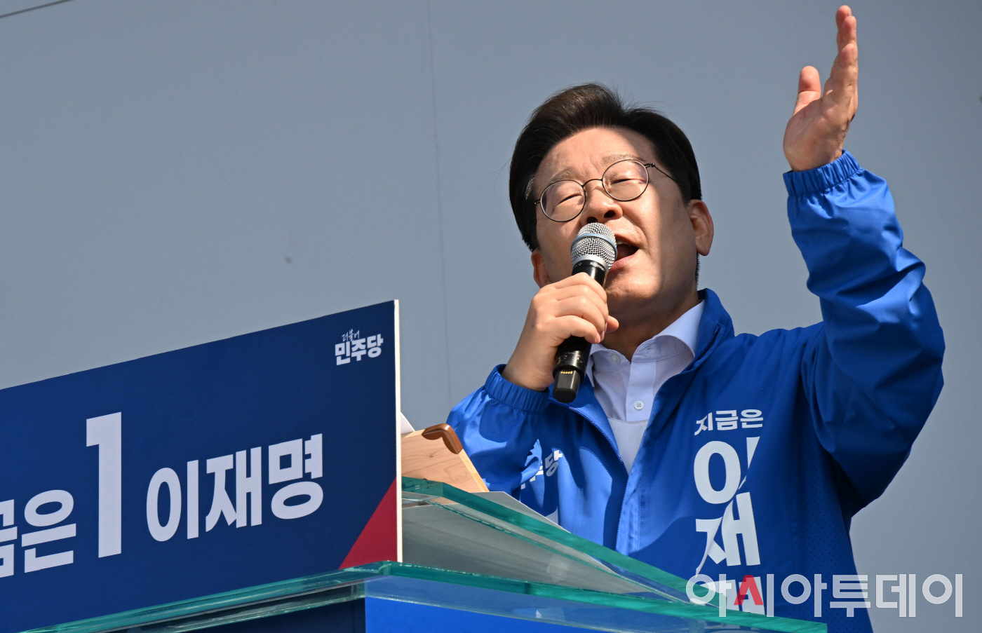 아시아투데이 이병화 기자 = 이재명 더불어민주당 대선후보가 12일 경기 화성시 동탄센트럴파크에서 열린 집중유세에서 연설하고 있다.