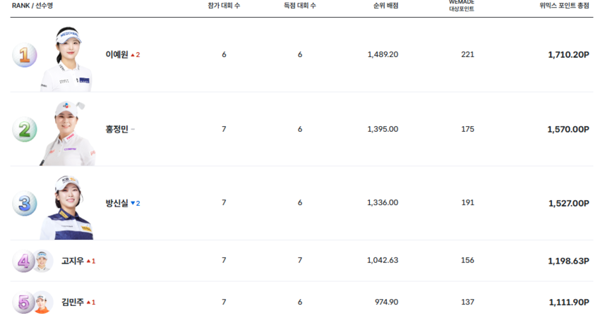 이예원은 우승상금 1억 8000만원을 챙기며 상금(5억296만4532원), 위메이드 대상포인트(221점), 위믹스 포인트(1,710P) 랭킹 각 부문에서 모두 1위에 올랐다.