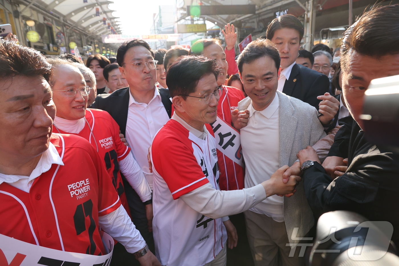(대구=뉴스1) ,김민지 기자 = 김문수 국민의힘 대통령 후보가 공식 선거운동 첫날인 12일 대구 서문시장을 방문해 상인 등과 인사를 나누고 있다. (공동취재) 2025.5.12/뉴스1