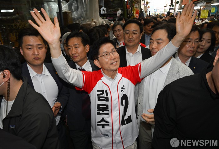 [대구=뉴스핌] 최지환 기자 = 김문수 국민의힘 대선후보가 12일 대구 서문시장을 방문해 지지자들을 향해 손을 흔들고 있다. 2025.05.12 choipix16@newspim.com