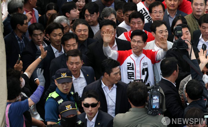 [대구=뉴스핌] 최지환 기자 = 김문수 국민의힘 대선후보가 12일 오후 대구 중구 서문시장에서 시민들과 인사를 나누고 있다. 2025.05.12 choipix16@newspim.com