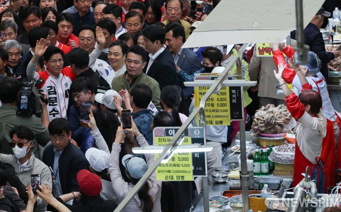 [대구=뉴스핌] 최지환 기자 = 김문수 국민의힘 대선후보가 12일 오후 대구 중구 서문시장에서 시민들과 인사를 나누고 있다. 2025.05.12 choipix16@newspim.com