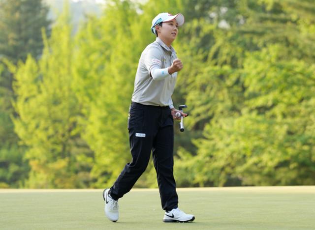 김효주가 11일 경기 고양시 뉴코리아CC에서 열린 레이디스 유러피언투어(LET) 아람코 챔피언십에서 우승을 확정한 뒤 기뻐하고 있다. 이 대회 2연패에 성공한 김효주는 오는 20일 미국으로 출국해 메이저 대회 US여자오픈을 준비한다. LET 제공 |